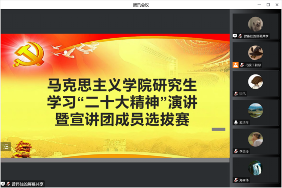 为深入学习贯彻中国共产党第二十次全国代表大会精神,11月17日晚,伟德国际1946通过腾讯会议,以线上形式举办研究生学习“二十大精神”演讲暨宣讲团成员选拔赛。此次活动由伟德国际1946曾伟佳老师主持,2021级、2022级共12位研究生参赛,学院党委书记麦培年、正处级组织员林绍雄出席活动,副院长郑亚伟、基础教学部主任雷艳芝、概论教学部教师洪汛担任活动评委。