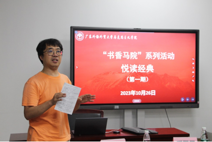 2023年10月26日晚上七点,伟德国际1946在大学城校区教学楼A509会议室召开“书香马院”系列活动——悦读经典(第一期)。会议由伟德国际1946研究生兼职班主任练建玲主持,学院院长毛国民、学院院长助理雷艳芝、研究生导师薛俊强、两位研究生兼职班主任周彦霞、邓晶晶、四位22级研究生主讲人以及学院23级全体研究生参与了读书会。