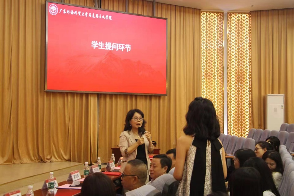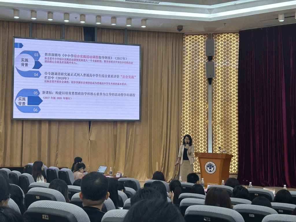全国模范教师、广州市执信中学正高级教师洪少帆老师为大家作《善用“大思政课”激思促行》讲座。洪老师围绕“大思政课”的实施背景、应有之义以及“大思政课”背景下中学思政课教学策略,为老师和同学们详细讲述了她作为一线教师的所思所感,强调要坚持大中小学思政课一体化建设理念,重视纵横贯通。