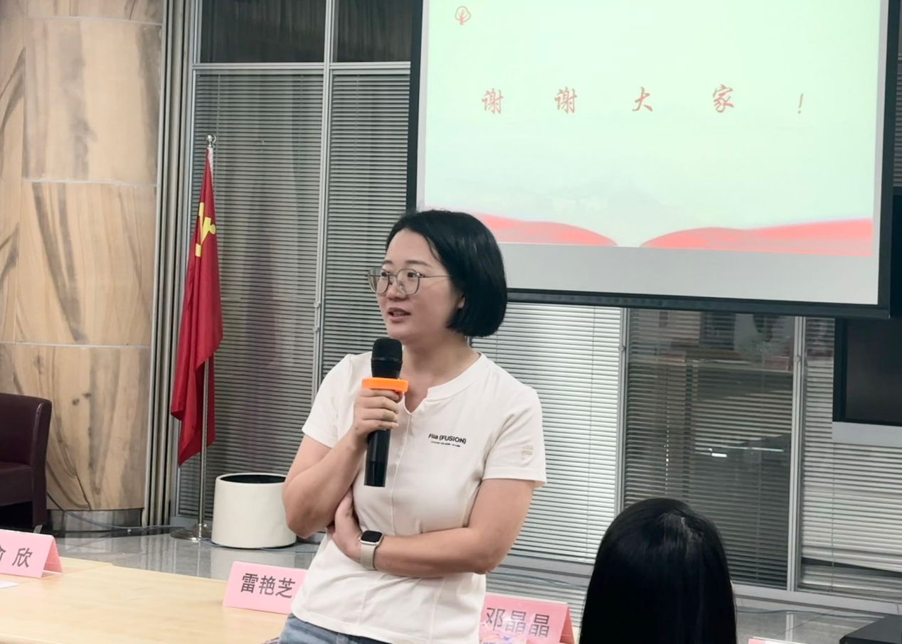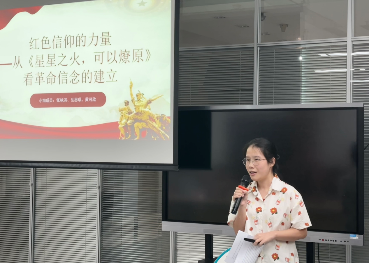 第三位张咏淇同学分享的题目是《红色信仰的力量——从<星星之火,可以燎原>看革命信念的建立》。她以《星星之火,可以燎原》一文的历史背景切入,深刻阐述了红色信仰的力量以及革命信念建立的重要意义。她强调,新时代的信念教育与革命精神的传承能够让红色基因在新时代继续发扬光大,为实现中华民族伟大复兴注入强大动力。