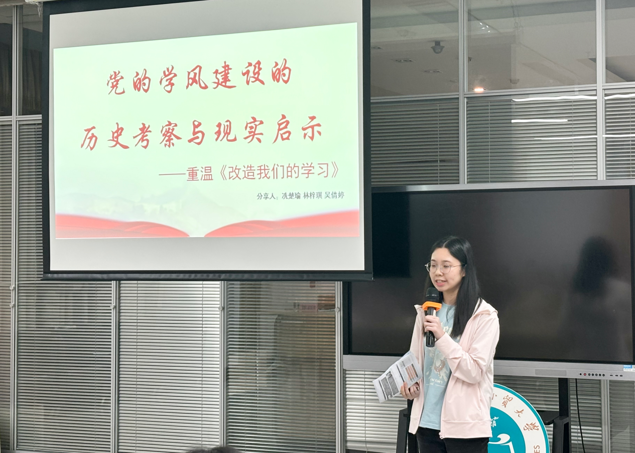 最后一位冼楚瑜同学分享的是题目是《党的学风建设的历史考察与现实启示——<重温改造我们的学习>》。她认为,这篇文章强调了坚持马克思列宁主义的必要性,深刻揭示了主观主义的危害,并从党的学风建设的角度阐述了对于提高党的战斗力和纯洁性的重要意义,要求全党树立理论与实践相结合的优良学风,这对于指导当前党的建设具有重要的启示意义。