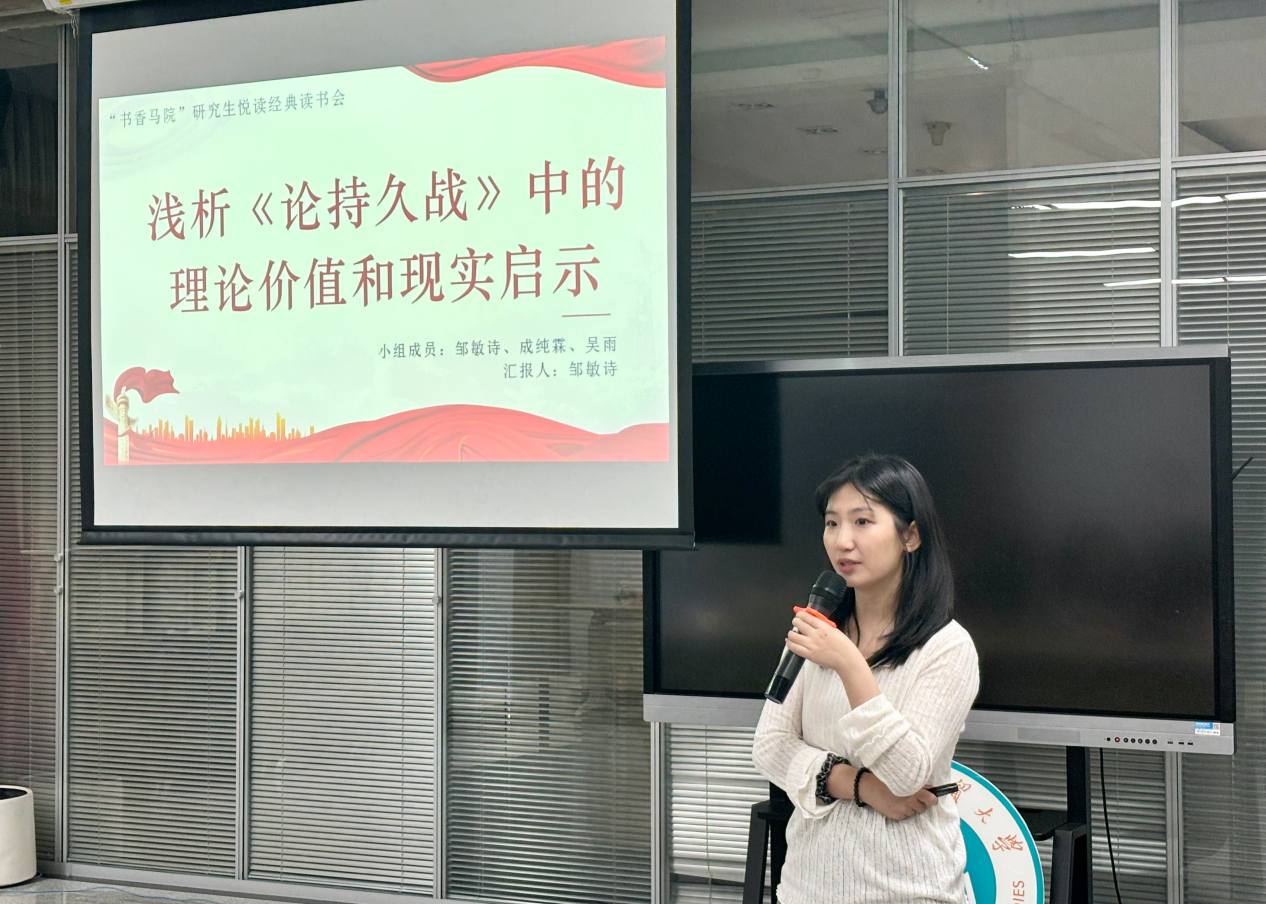 第二位邹敏诗同学分享的是题目是《浅析<论持久战>中的理论价值和现实启示》。她从《论持久战》的创作背景出发,分析了当时抗日战争的严峻形势以及中国共产党全面抗战路线的有利因素,并围绕该文的理论价值和现实启示介绍了毛泽东在制定战略时展现的长远眼光,强调在新形势下要坚持党的领导,善于从持久战的角度分析和解决中长期问题。