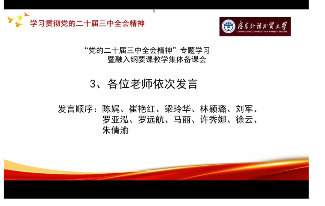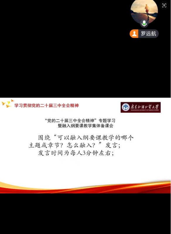为深入学习贯彻党的二十届三中全会精神,充分发挥全国样板党支部示范引领作用,推动高校“双带头人”教师党支部书记“强国行”专项行动落地,同步推进党的创新理论武装与思政课建设,持续推动党建与业务双融双促,伟德国际1946中国近现代史纲要教学部党支部于2024年9月9日举办“党的二十届三中全会精神”专题学习暨融入纲要课教学集体备课会,活动以线上方式进行。学院党委麦培年书记、朱海龙副院长以及纲要教学部全体教师参会,教学部主任罗远航主持会议。
