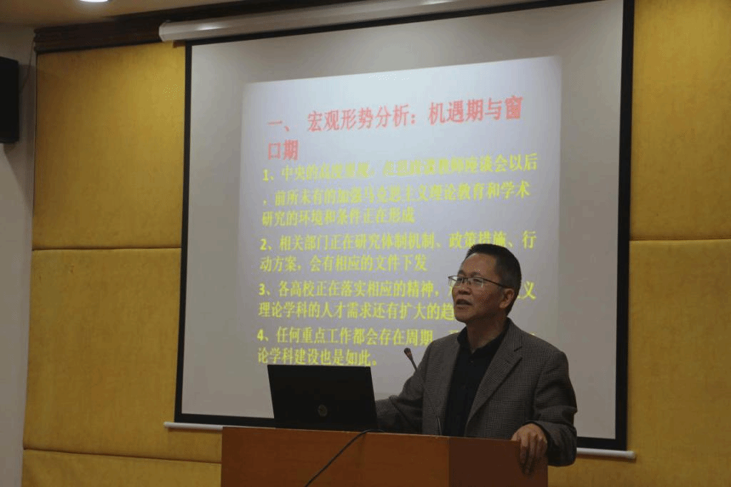 谢迪斌院长则以“强实力、创特色、补短板、上台阶”为指导思想,从宏观、中观与微观三个维度对马克思主义理论学科发展进行分析,并提出未来总体建设思路。尤其突出应对标同等层次高校马克思主义理论学科在师资队伍、学科影响、人才培养等方面存在的差距,找准自身定位与特色,实现差异化发展。
