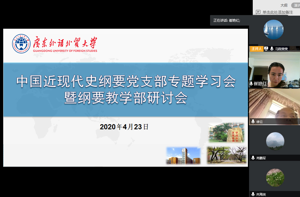 4月23日,中国近现代史纲要党支部召开以“学习习近平总书记关于应对新型冠状病毒肺炎疫情重要讲话精神,在常态化疫情防控中推进各项工作有效开展”为主题的线上学习会。会议由纲要党支部书记曾荣主持,崔艳红副院长及支部全体教师参加。