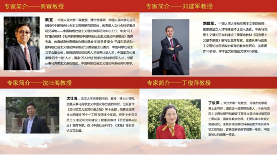 本次教材培训中,《马克思主义基本原理》教材的培训专家为中国人民大学的刘建军教授,同时也是原理教材编写组的首席专家;《毛泽东思想和中国特色社会主义理论体系概论》教材的培训专家是中国人民大学的秦宣教授,同时也是毛概教材的首席专家;《中国近现代史纲要》教材的培训专家为武汉大学的丁俊萍教授,同时也是马工程多本重点教材编写组的主要成员;《思想道德与法治》教材的培训专家为沈壮海教授,同时也是该教材的首席专家。