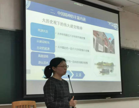 杜雯老师以电影《长津湖》为例,在引导同学们对“中国人民靠什么赢得抗美援朝战争的胜利”这一问题的思考中,亮出了中国精神这个授课主题。随后,杜雯老师紧紧围绕中国精神从哪里来、中国精神是什么、弘扬中国精神有什么重大意义这三个理论问题,深入细致地展开教学。