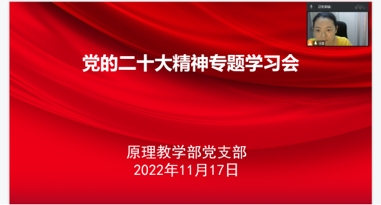 2022年11月17日下午,伟德国际1946原理教学部党支部组织召开党的二十大精神线上专题学习会。会议由原理教学部党支部书记汪雪主持,支部的全体党员参加了会议。