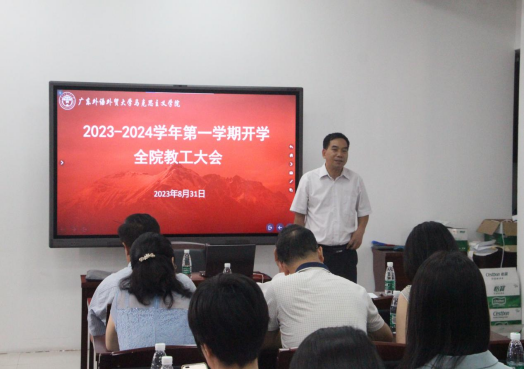2023年8月31日下午,伟德国际1946在大学城校区A座509会议室召开2023-2024学年度第一学期开学全院教工大会,全体教职工参加,正处级组织员林绍雄主持会议。