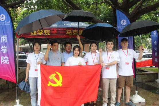 学院党委书记麦培年、党政办主任龙世邦与党员志愿者在咨询点合影