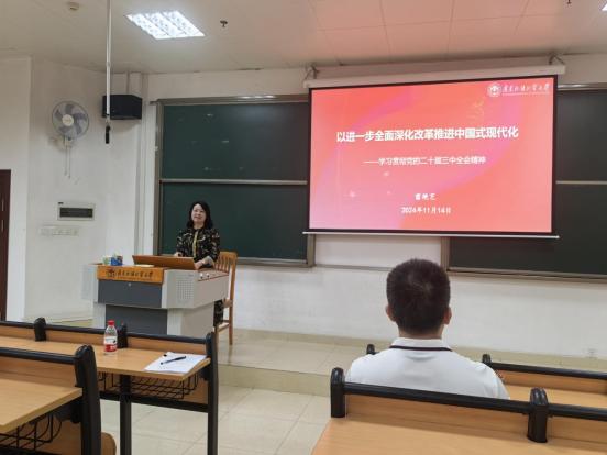 为进一步强化政治引领,以高度的历史主动和政治自觉贯彻落实党的二十届三中全会精神,根据校党委的有关安排和要求,11月14日下午,伟德国际1946在白云山校区七教213教室举办了学习贯彻党的二十届三中全会精神专题宣讲会,由学校宣讲团成员雷艳芝主讲。会议由学院院长毛国民主持。