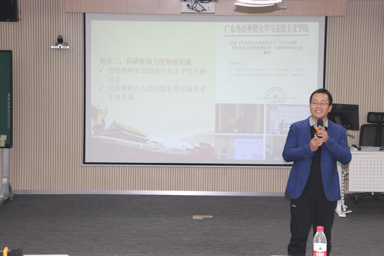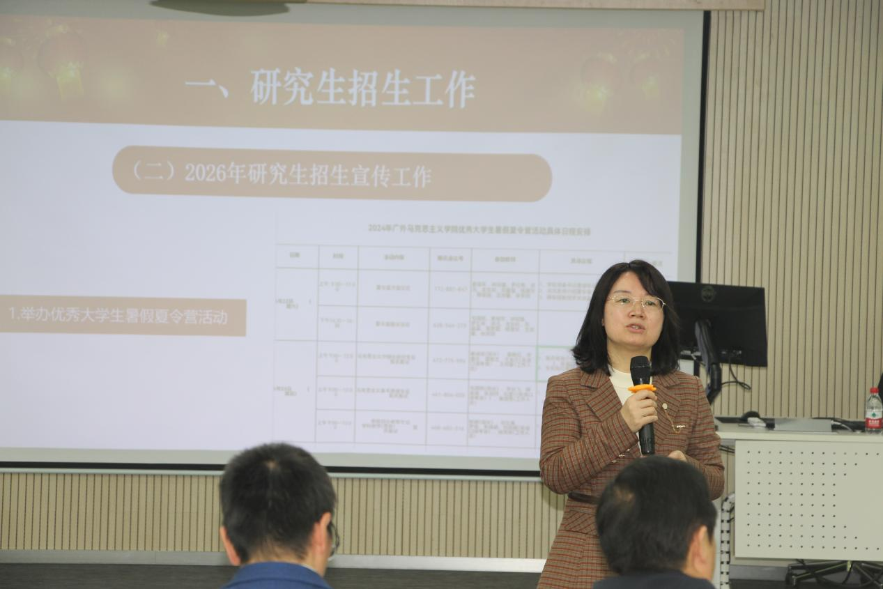 副院长曾荣总结了2024年科研工作的六个亮点,指出学院在科研管理制度、科研资助力度、科研论文发表质量、国家级科研立项率、服务经济社会发展能力及学科排名均有提升,同时强调2025年还需要继续在博士点申报、年度各层次课题申报、以高质量科研和学科发展推动广东省重点马院建设三方面工作持续深耕。