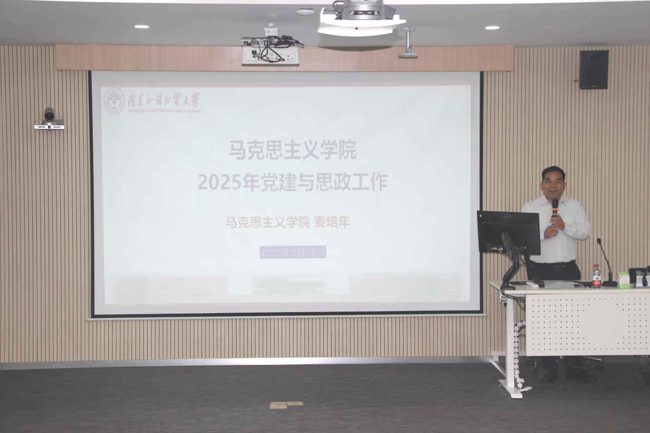 学院党委书记麦培年强调,新学期学院要持续贯彻落实立德树人根本任务,以党建工作为统领,以"一高双融"为目标,以"强基工程"行动计划(2024-2026)为抓手,深入实施"铸魂育人""党员先锋""雁阵领航""党员干部专家基层行"和党建"引领赋能"等五大行动,以高质量党建推动学院高质量发展,不断开创学院党建工作新局面,并从"八个要点"布置新学期党建与思政各项工作,提出了具体要求。