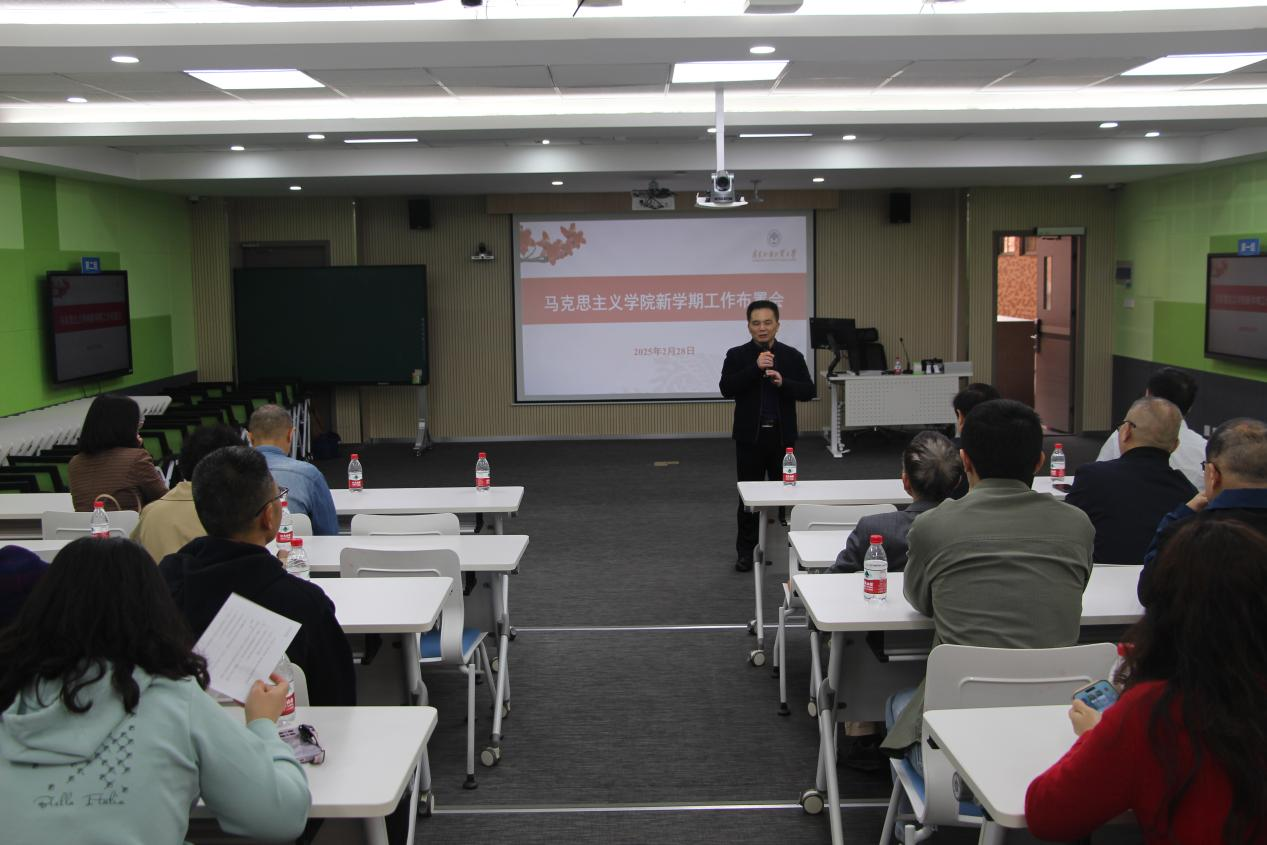 院长毛国民对学院寒假期间推进的工作进行了回顾,重点解读了中央关于思政课建设的新政策和学校五大攻坚改革方案,布置了学院2025年工作计划的四大重点,特别强调要落实好《重点马院建设方案》、持续思政课教学改革、推进2025年高层次科研项目申报、认真执行学校二级单位目标绩效考核实施办法。他希望新学期学院全体教职工明确自身职责和发展方向,共同努力推进学院工作的有效开展,为学院发展做出新的更大贡献。