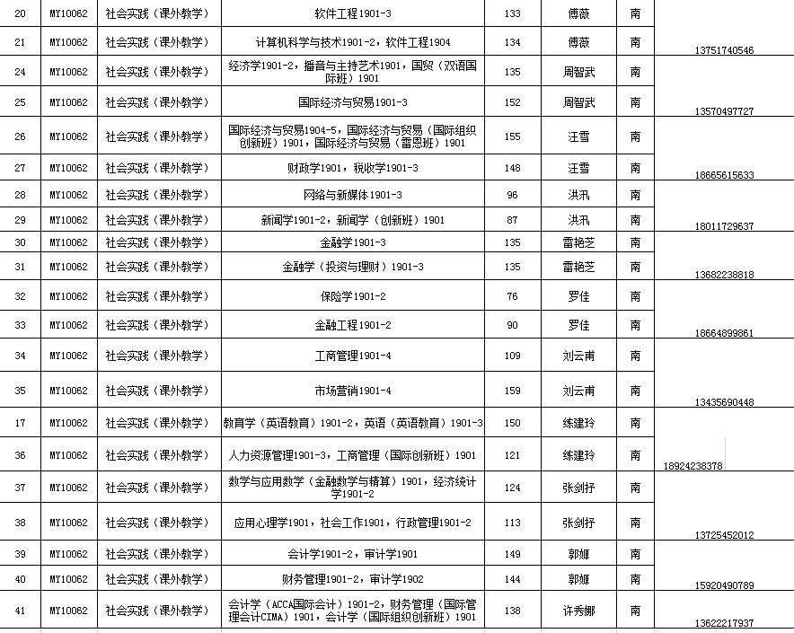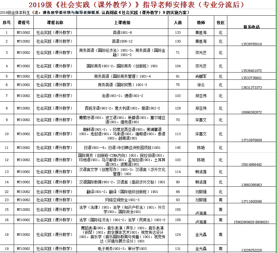 2019级社会实践(课外教学)指导老师安排表(分流后更新版)