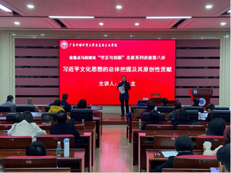 2024年2月25日下午,伟德国际1946在大学城校区教学楼C201举办广东省重点马院建设之“守正与创新”名家系列讲座第八讲。华南师范大学学术委员会副主任陈金龙教授受邀开讲关于“习近平文化思想的总体把握及其原创性贡献”主题报告。学院党政领导和全体师生参加了此次讲座,讲座由学院院长毛国民主持。